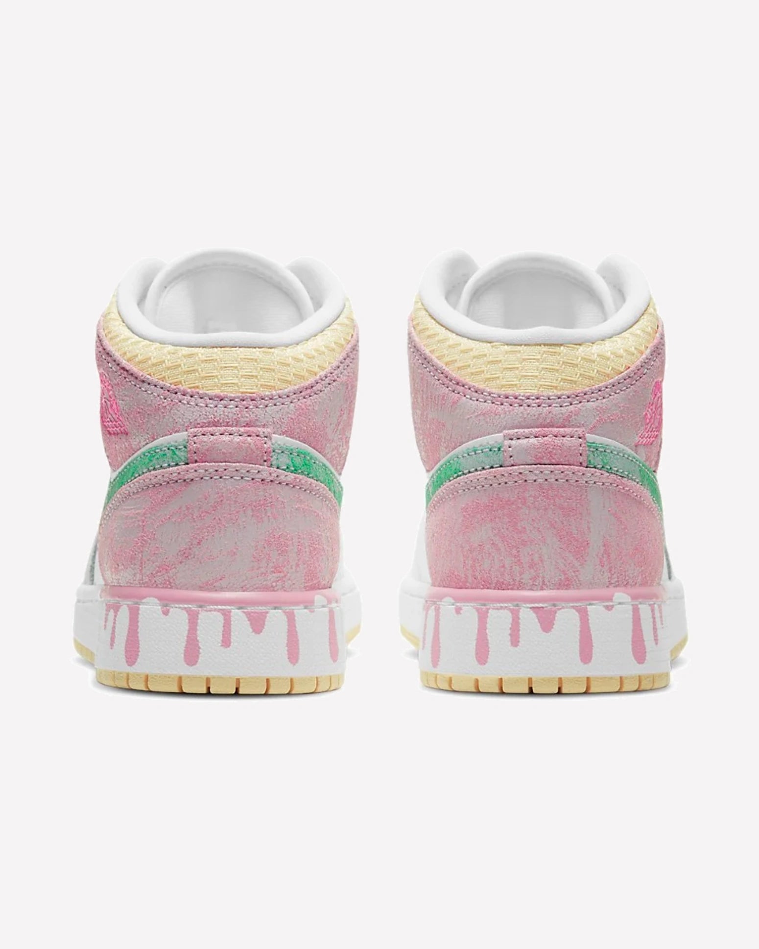 La parte superior de estas zapatillas fusiona el arte del goteo de pintura con una paleta de colores vibrante. El cuero pintado en tonos rosa y verde menta se superpone sobre una base de piel blanca, creando un contraste audaz y atractivo. Este diseño no solo refleja la calidad y la artesanía distintiva de Jordan, sino que también agrega un toque de expresión artística a la silueta clásica de las Air Jordan 1 Mid.