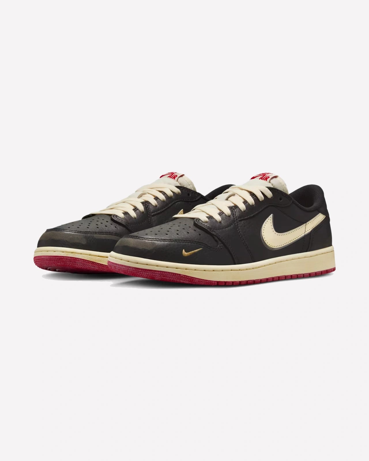 En materia de diseño, el Swoosh lateral en tono crema se lleva el protagonismo y dialoga con los cordones, la lengüeta y la mediasuela en el mismo color envejecido. El talón luce el logotipo Wings en crema sobre pieza negra, un guiño directo al ADN Jordan. En la puntera aparece un mini Swoosh dorado que añade un punto exclusivo, mientras que el branding “Nike Air” en rojo sobre la lengüeta aporta contraste deportivo. La suela exterior roja remata el conjunto con agarre y personalidad, y su perfil bajo favorece una pisada cómoda y versátil para moverse con estilo en cualquier escenario urbano.