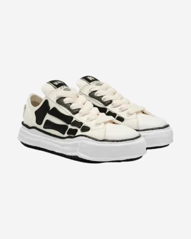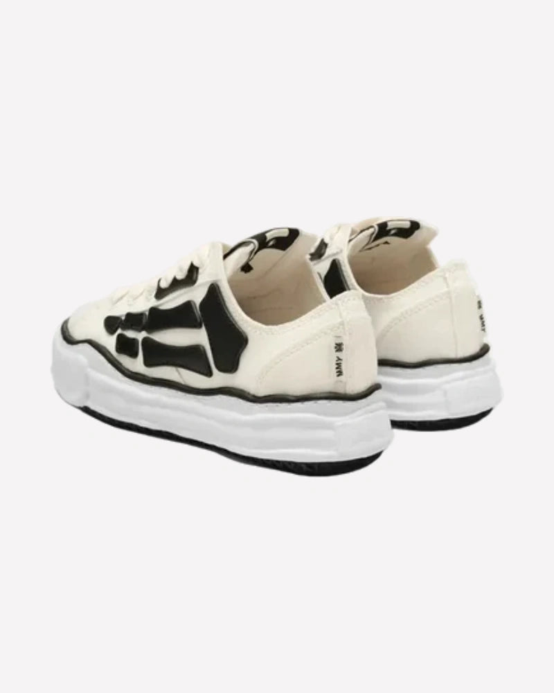 Estas sneakers están confeccionadas en lona de color crema que sirve como base para una impactante superposición en negro con forma de esqueleto, evocando la ya icónica estética “Bones” de AMIRI. Los paneles en relieve simulan los huesos de un pie, creando un contraste visual poderoso y altamente reconocible. Los cordones gruesos en tono crudo refuerzan el look desenfadado y robusto, mientras que la suela oversized, característica de Mihara Yasuhiro, aporta volumen y un toque desestructurado que rompe con los esquemas convencionales. El acabado ligeramente envejecido en la entresuela añade un aire vintage que refuerza su carácter urbano.