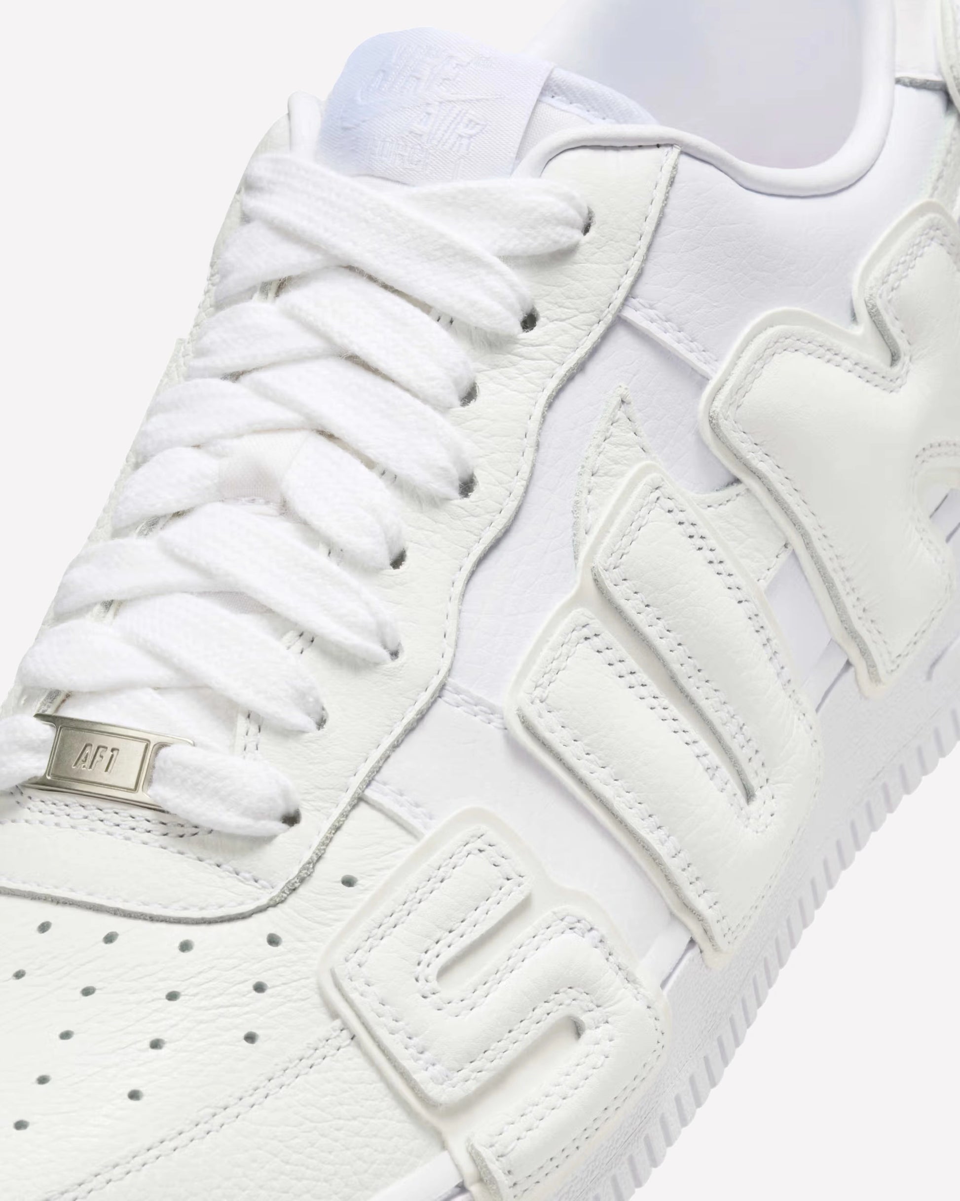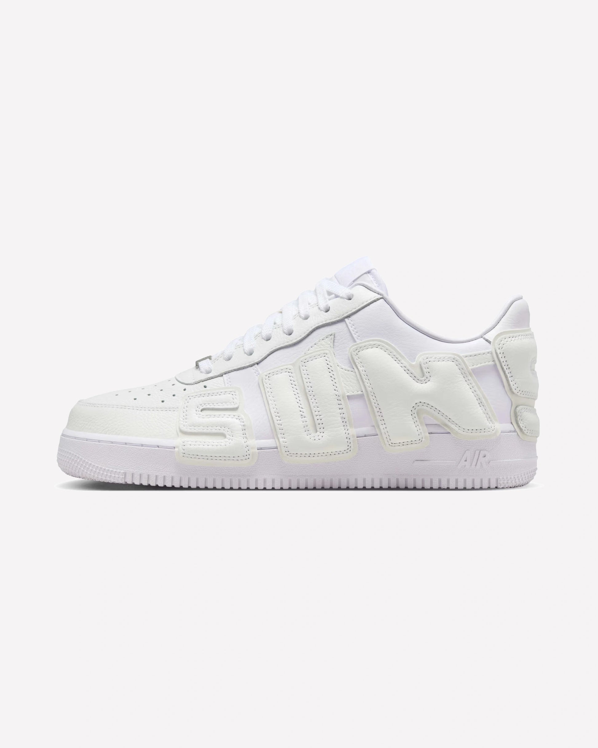 Diseñadas con una base completamente blanca, estas Air Force 1 destacan por sus superposiciones en relieve que forman la palabra "SUNSHINE" a lo largo del lateral exterior. Las letras están confeccionadas en materiales acolchados con costuras visibles, aportando textura y dimensión al diseño sin comprometer la estética limpia y monocromática que caracteriza a este modelo. La parte superior combina cuero premium con detalles sintéticos, mientras que la suela de goma blanca mantiene la comodidad y durabilidad características del modelo Air Force 1. Los detalles perforados en la puntera aseguran ventilación, y el sistema de cordones blancos mantiene el look sobrio y uniforme.
