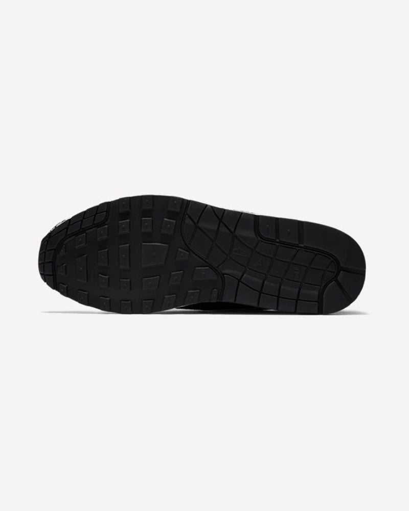 En cuanto a materiales, la Nike Air Max 1 atmos Elephant (2017) presenta una combinación de nobuck negro y cuero blanco de alta calidad, proporcionando un equilibrio perfecto entre suavidad, resistencia y estilo premium. El detalle más llamativo es, sin duda, el icónico “Elephant print” en gris y negro que adorna la puntera, el talón y los laterales, aportando textura y un toque salvaje al diseño. El Swoosh en “Clear Jade” brillante resalta sobre el fondo oscuro, añadiendo un contraste vibrante que le da vida a todo el conjunto. La mediasuela blanca con la clásica unidad Air visible completa el look con el confort que caracteriza a la línea Air Max.