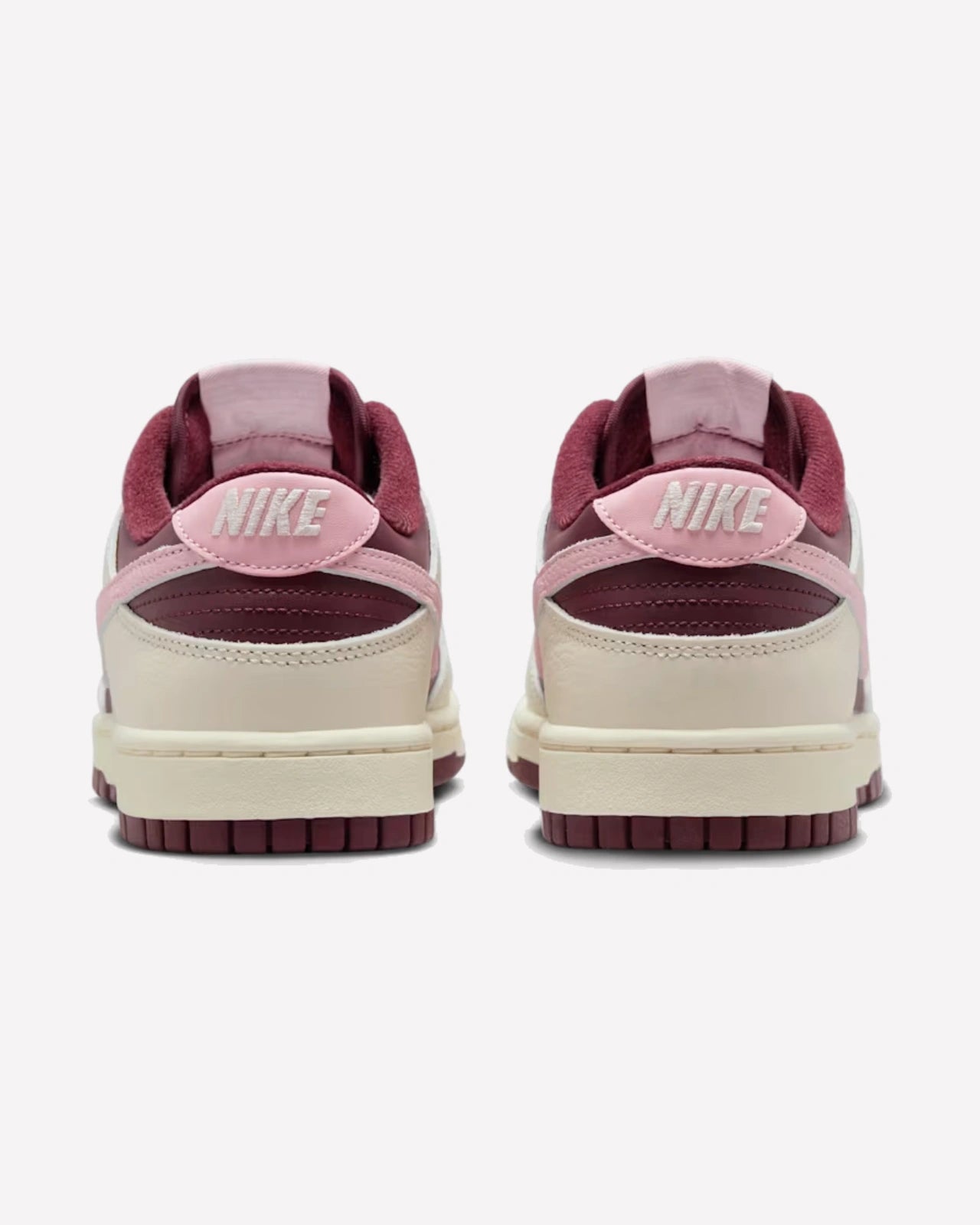 Los Nike Dunk Low Valentine's Day están diseñados con una parte superior de piel en tonos burdeos y marrón claro verdoso, creando una combinación de colores rica y sofisticada. El Swoosh de piel granulada en rosa agrega un toque distintivo y femenino, capturando la esencia del romance en cada detalle. Estos sneakers de edición limitada son más que simples zapatillas; son una expresión de amor y estilo.