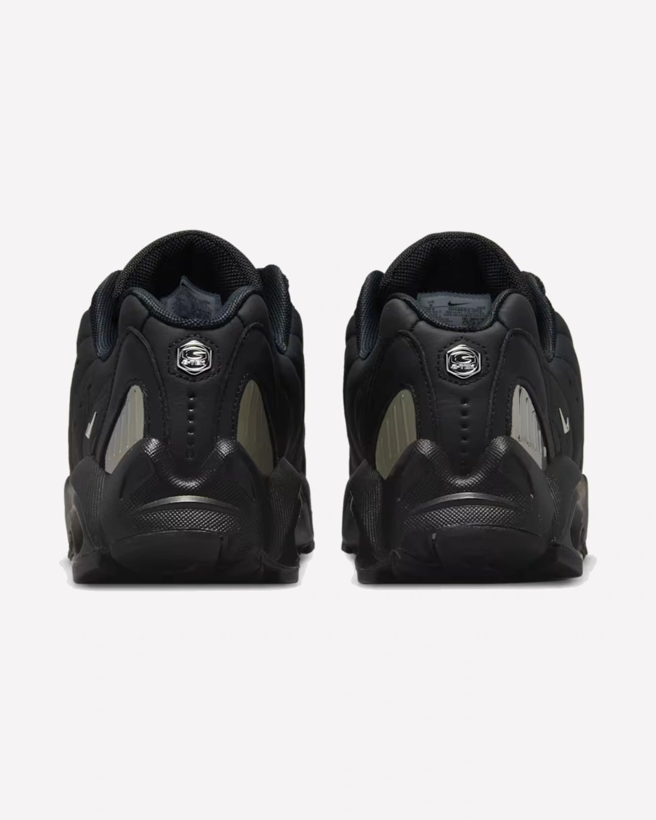 Con una construcción íntegra en cuero negro de alta calidad, el upper presenta líneas fluidas y perforaciones estratégicamente ubicadas que aportan respirabilidad y acentúan la forma aerodinámica del diseño. La zapatilla incorpora detalles reflectantes sutiles y un mini Swoosh plateado en el lateral medio que rompe con el total black sin perder discreción. La unidad Air visible en el talón, en este caso con un sutil tono verde neón, se integra perfectamente en la mediasuela negra, ofreciendo amortiguación reactiva sin comprometer la estética. La suela exterior incluye secciones en azul oscuro, inspiradas en calzados de trail, y tecnología G-Tek, lo que garantiza tracción y durabilidad para el uso urbano cotidiano.