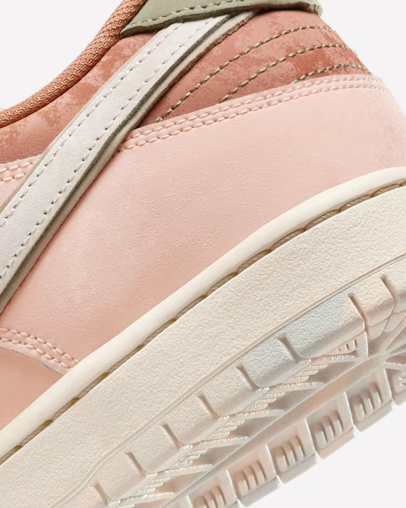 Construida con una mezcla de cuero premium y nobuk, la parte superior presenta una paleta de colores suaves que van desde el melocotón hasta el beige, con detalles en crema que realzan su estética elegante. La puntera perforada en tono terracota contrasta sutilmente con los paneles laterales en un melocotón más claro, mientras que el Swoosh en un beige apagado aporta equilibrio al diseño. El forro interior en color naranja quemado y el refuerzo del talón en verde oliva añaden profundidad a la paleta cromática, evocando la vegetación y la arquitectura clásica de los jardines parisinos. Todo esto se asienta sobre una entresuela beige y una suela de goma en tono crema, garantizando un excelente agarre y durabilidad.