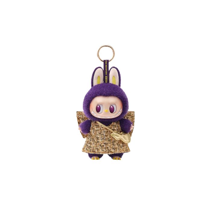 El llavero presenta a Labubu vestido con un llamativo atuendo de tela que imita un saco, en tonos marrones y dorados, complementado con detalles en el sombrero que asemejan las orejas de un conejo. Su rostro, que refleja una gran expresión juguetona con ojos grandes y afilados colmillos, es un contraste perfecto con su aspecto tierno. El cuerpo de Labubu, cubierto de un suave pelaje morado, añade un toque de calidez y carácter al diseño. Este llavero está equipado con un anillo metálico en la parte superior, lo que te permite colgarlo fácilmente en mochilas, llaves o cualquier otro accesorio personal.