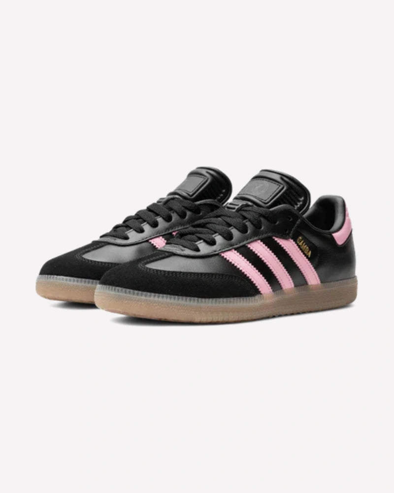 El diseño de estas zapatillas presenta una base de cuero negro de alta calidad, acompañada por superposiciones en ante negro en la puntera, lo que aporta textura y profundidad visual. Las tres franjas laterales y el panel del talón destacan en un vibrante tono rosa claro, símbolo distintivo del Inter Miami CF, ofreciendo un contraste elegante y moderno. El logo "SAMBA" aparece en dorado en el lateral, agregando un toque premium. La lengüeta de gran tamaño y la suela de goma translúcida en tono caramelo completan el look, manteniendo la silueta retro que tanto caracteriza a las Samba.