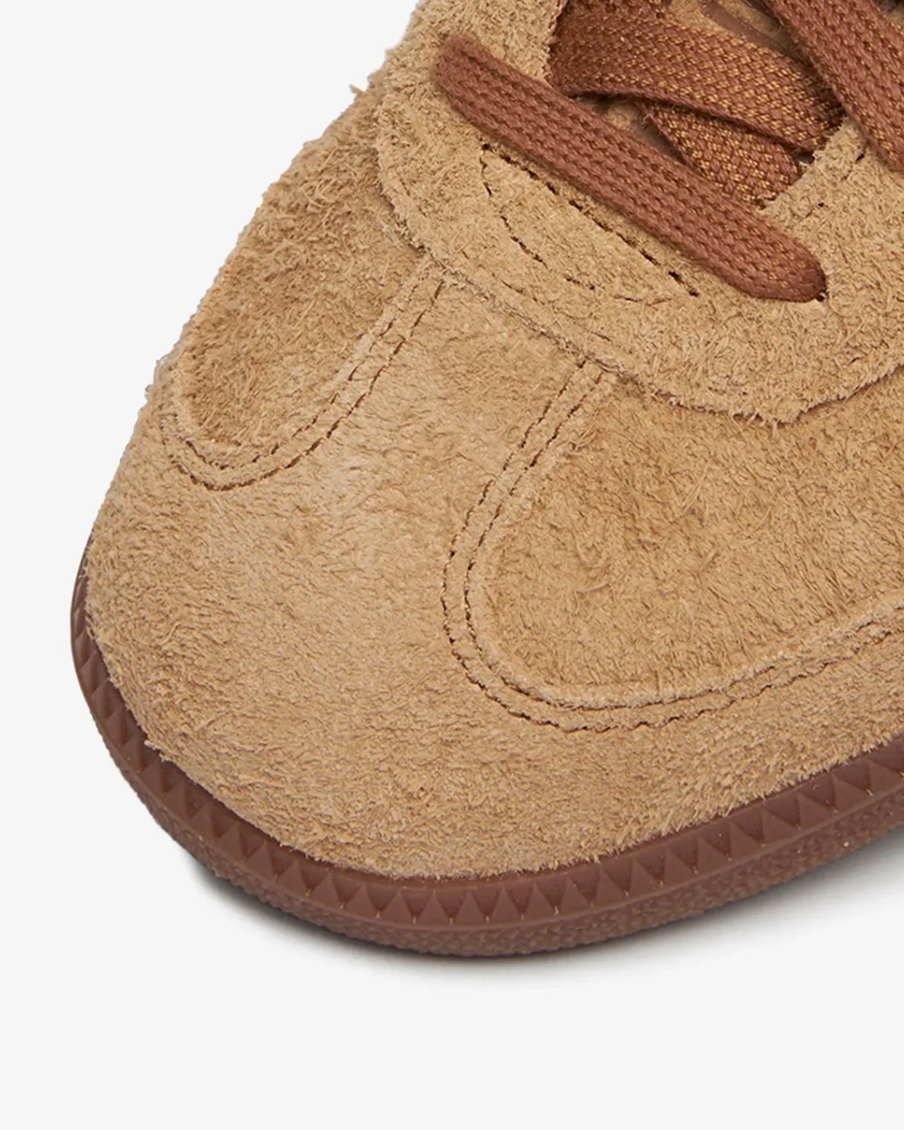 El diseño de esta edición especial destaca por su upper confeccionado en gamuza texturizada de tono amarillo mostaza, con un acabado de pelo largo que aporta carácter y profundidad visual. Las tres franjas laterales y el panel del talón se presentan en un tono marrón más oscuro que complementa con elegancia el resto del cuerpo, generando un contraste sutil y sofisticado. La lengüeta, también en gamuza, conserva el look monocromático, mientras que la suela de goma en color goma caramelo mantiene la esencia original de la Samba, proporcionando tracción y durabilidad. Como toque discreto pero distintivo, el nombre de JJJJound aparece en dorado sobre el lateral exterior, consolidando la identidad de esta colaboración sin alterar la estética limpia del conjunto.
