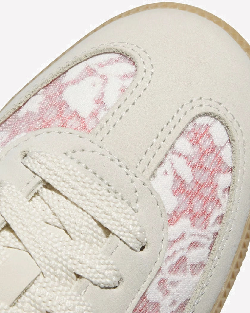 El upper está confeccionado en una mezcla de textil estampado y superposiciones en cuero premium, lo que le otorga tanto durabilidad como un acabado refinado. La puntera reforzada en ante beige claro mantiene la estructura clásica de las Samba, mientras que la lengüeta blanca con detalles dorados y el talón en rojo escarlata completan el look con un toque elegante. Todo el conjunto se asienta sobre la tradicional suela de goma color caramelo, que no solo conserva el estilo vintage del modelo original, sino que ofrece tracción y comodidad para el uso diario.