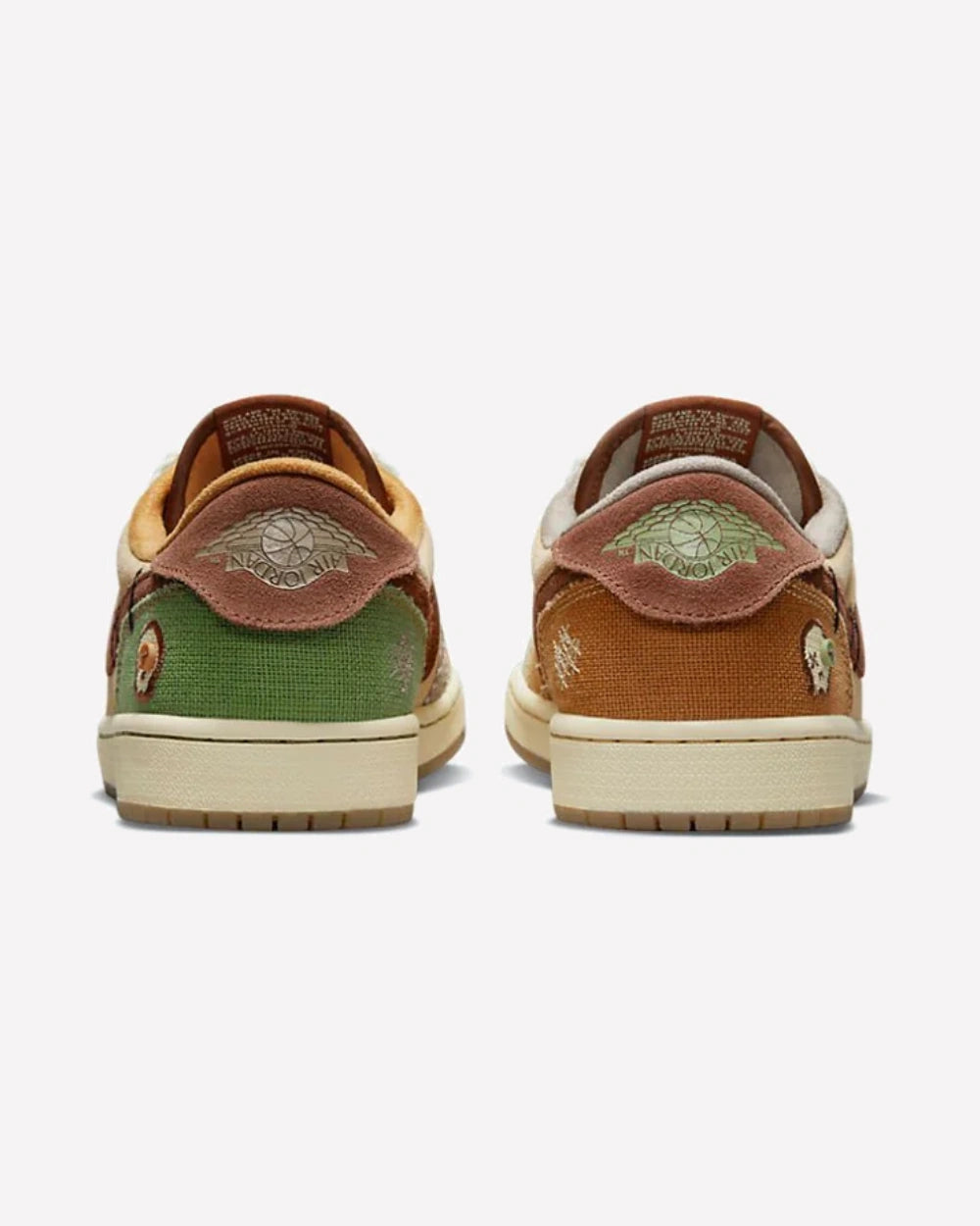 El diseño distintivo de estas Air Jordan 1 Retro Low destaca con una puntera de ante marrón y un panel lateral de ante beige, creando un contraste visual que atrae miradas. Las superposiciones rugosas en tonos marrón pálido, fossil y oil-green añaden profundidad y textura, creando una estética única que combina a la perfección estilo y originalidad. El toque de misterio viene de la figura de muñeco vudú bordada en el talón lateral, agregando un elemento intrigante y único al diseño.
