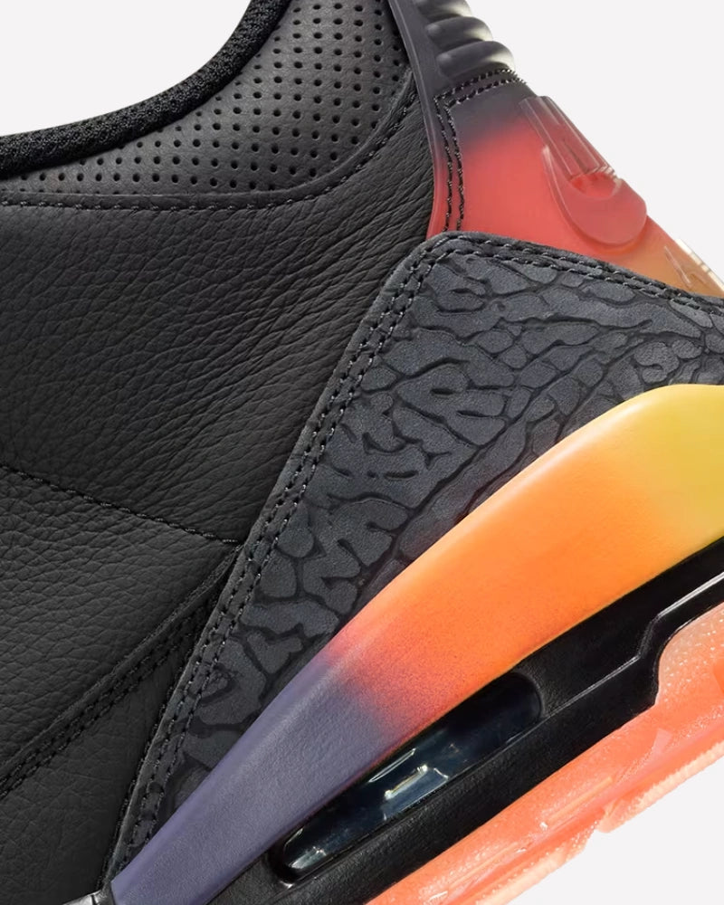 El diseño de estas Jordan 3 mantiene la esencia clásica de la silueta, con una parte superior confeccionada en cuero negro de alta calidad que ofrece durabilidad y un look elegante. El característico elephant print en el guardabarros y el talón se mantiene en tonos oscuros para un acabado sobrio y premium. Lo que realmente resalta en este modelo es el espectacular degradado en la parte trasera, que combina tonalidades de rojo, naranja y amarillo, evocando la calidez del sol al caer la tarde. Además, la mediasuela también incorpora esta transición de colores, creando una estética única. El branding en la lengüeta y el talón presenta detalles en amarillo, mientras que la suela de goma translúcida en tonos rojizos complementa el diseño. Como toque especial, el par viene acompañado de un hangtag con la icónica carita feliz de J Balvin, un detalle distintivo de sus colaboraciones con Jordan Brand.
