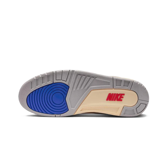 El upper está confeccionado en un cuero premium de tonalidad crema, aportando una textura suave y refinada, mientras que los paneles de piel granulada se complementan con los característicos refuerzos de “elephant print” en gris tostado, que añaden una dimensión clásica y robusta al diseño. La entresuela en tono beige envejecido refuerza el look vintage, equilibrando perfectamente con los detalles en azul intenso y rojo vivo que aparecen en los ojales, el forro interior y el logo “NIKE” en la suela. Estos colores hacen alusión directa a la bandera surcoreana, destacando también en el talón con un acolchado en azul satinado que contrasta con el rojo del interior. La suela combina tonos grises con acentos en azul royal y rojo, añadiendo carácter desde la base.