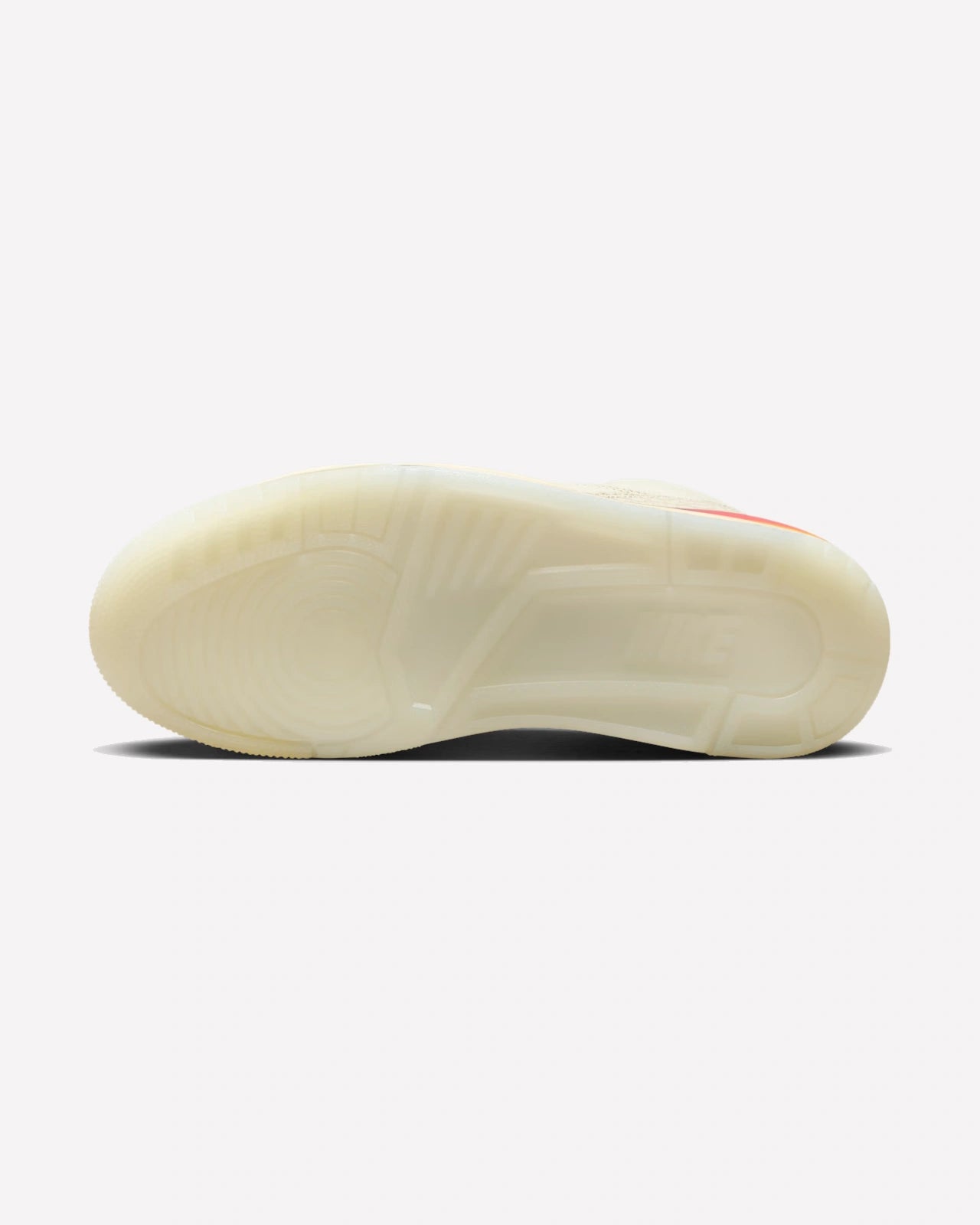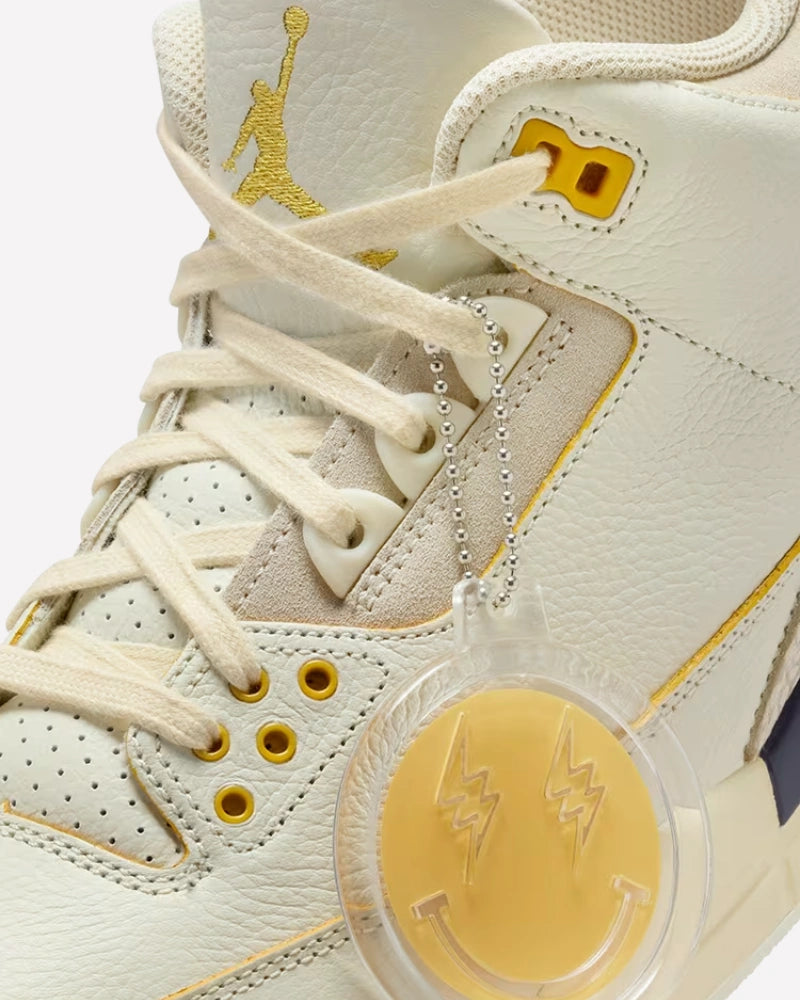La parte superior de cuero marfil de estas zapatillas se convierte en una paleta artística que incorpora detalles de estampado de elefante en tonos en la puntera y el talón, rindiendo homenaje al clásico modelo Jordan 3. Este toque distintivo añade una capa de textura y complejidad al diseño, creando una conexión visual entre el pasado y el presente de la línea Jordan.