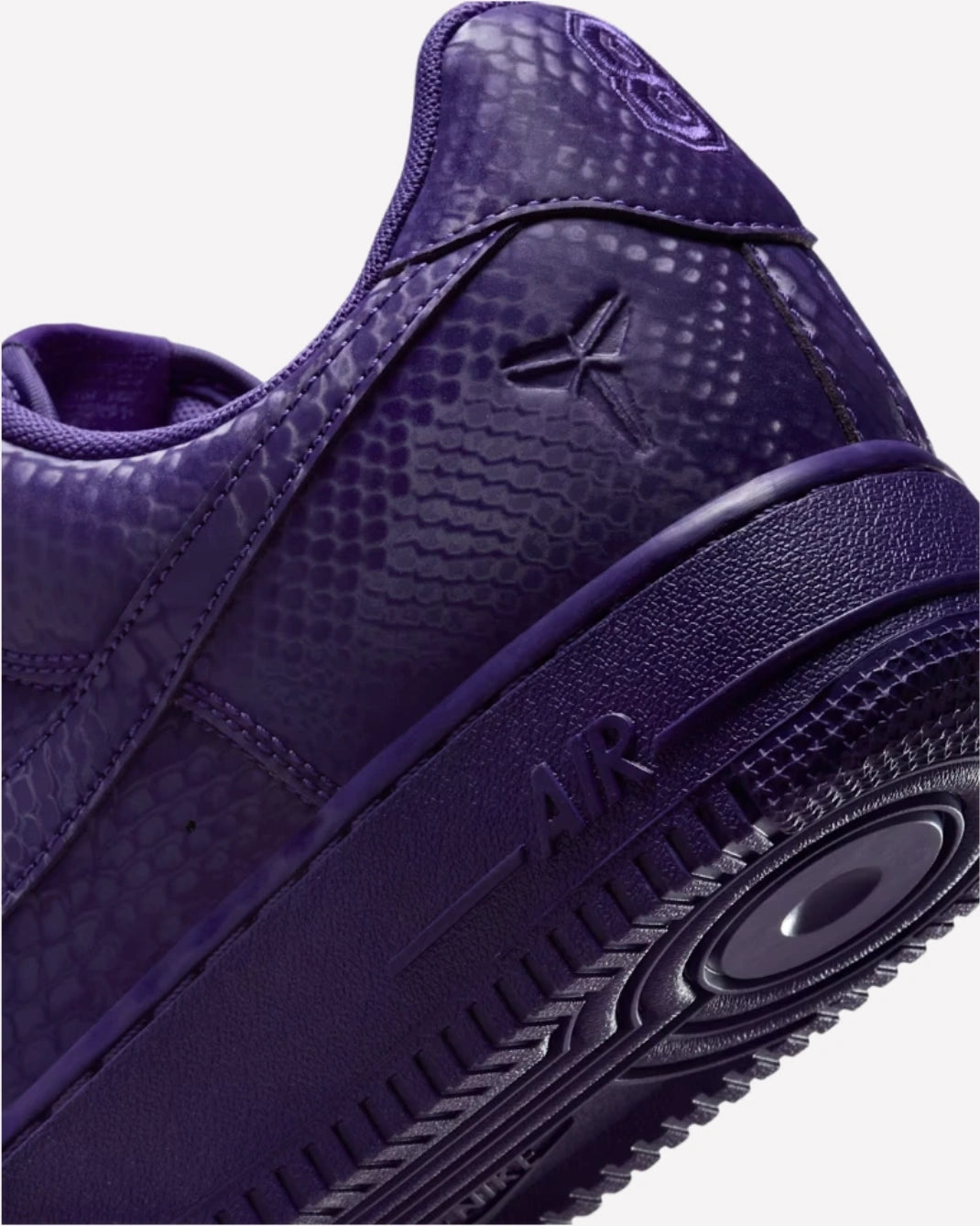 Estas Air Force 1 presentan un diseño de cuero con textura de piel de serpiente en todo el upper, un claro guiño al apodo de Kobe, "Black Mamba". El color Court Purple cubre completamente la silueta, incluyendo la suela, los cordones y el forro interior, logrando un look monocromático llamativo y sofisticado. En el talón se encuentran los números 8 y 24, ambos grabados en relieve, representando los dorsales que Kobe llevó durante su legendaria carrera con los Lakers. Además, el icónico logotipo del Mamba se encuentra sutilmente grabado en la parte baja del talón, aportando un toque de exclusividad y significado personal.