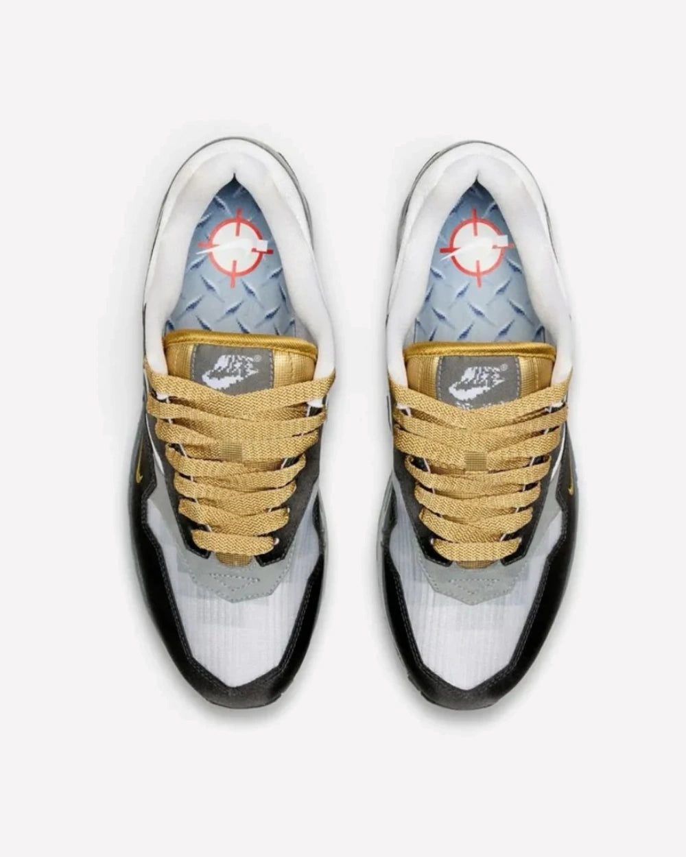 A nivel de diseño, este modelo destaca por su atrevida mezcla de colores y materiales. La parte superior combina paneles en tonos blanco, gris y negro con texturas mate y suaves contrastes, que imitan los polígonos y sombras simples de los videojuegos antiguos. El Swoosh lateral aparece en una forma pixelada con bordes irregulares, dándole un toque glitch que homenajea directamente el mundo digital. Los cordones en dorado mostaza aportan un contraste cálido y elegante, complementados por un mini Swoosh bordado en el lateral delantero del mismo color. La media suela gris oscuro integra la clásica unidad Air visible en el talón, mientras que la suela negra refuerza el look robusto y urbano de la zapatilla.