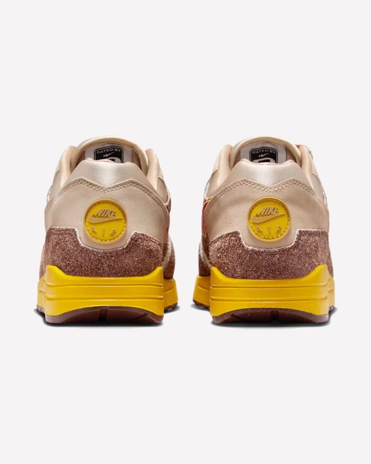 El diseño combina tonos tierra y acentos vibrantes en una construcción rica en texturas. La parte superior presenta paneles de gamuza en marrón chocolate de acabado rugoso que se contrastan con secciones en beige claro y textil en tonos crema. Lo que más llama la atención es el Swoosh lateral en rojo brillante con borde amarillo, que aporta una estética llamativa y estilo retrofuturista. La mediasuela amarilla vibrante refuerza esta identidad única, mientras que la suela marrón mantiene la cohesión con el upper. Detalles como el logotipo de Nike rediseñado en el talón, acompañado del texto “Rated by .SWOOSH”, refuerzan la temática del metaverso y la innovación.