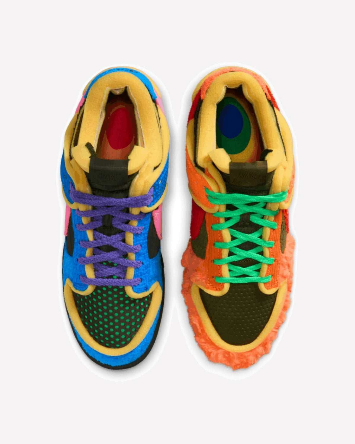 El diseño juega con una mezcla vibrante de materiales y tonos contrastantes en cada pie, creando un efecto mismatched (desparejado) que se ha convertido en un sello distintivo del enfoque de CPFM. La zapatilla izquierda combina azul intenso con un Swoosh fucsia y detalles en amarillo pastel, mientras que la derecha mezcla naranja neón con rojo, verde y más toques en amarillo. Toda la parte superior está construida con una combinación de felpa de textura rugosa y malla técnica, aportando tanto volumen como profundidad visual. Los cordones dobles —uno convencional y otro tipo cuerda— refuerzan esa sensación caótica pero cuidadosamente diseñada. La base en negro mate crea un equilibrio necesario entre tanto color, manteniendo el conjunto coherente y llamativo a la vez.