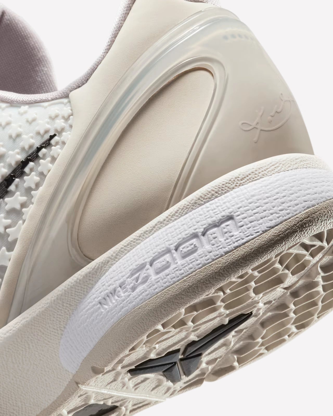 La parte superior de la Nike Kobe 6 Protro Sail All-Star está construida con una malla ligera que asegura transpirabilidad y comodidad, mientras que su diseño incluye el icónico Swoosh negro que contrasta perfectamente con el color blanco de la zapatilla. En la entresuela, cuenta con la tecnología Zoom Air, que proporciona un excelente retorno de energía y amortiguación, ideal para jugadores que buscan rapidez en la cancha. Además, la suela de goma con patrón de tracción ofrece un agarre excepcional, asegurando estabilidad y control incluso en los movimientos más exigentes.