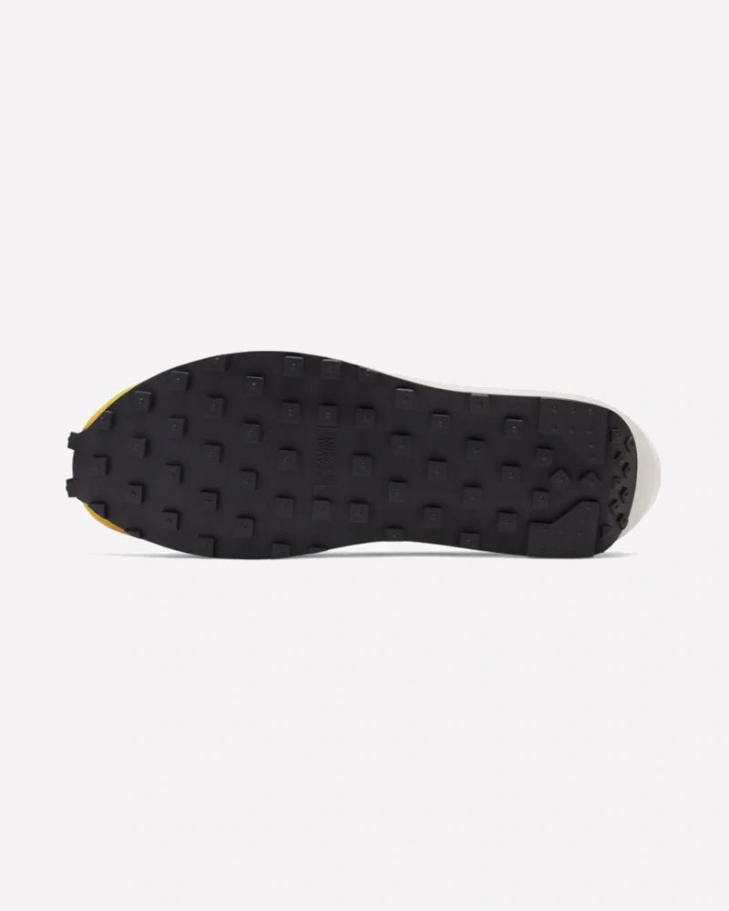 Este modelo está confeccionado con una base de malla verde lima que le da un acabado liviano y transpirable, acompañada de superposiciones en gamuza amarilla mostaza en la puntera y el talón. El toque visual más impactante llega con los Swooshes dobles en los laterales: uno en negro y otro en un vibrante tono naranja neón que se superponen, aportando dinamismo y profundidad al diseño. La doble lengüeta, el sistema de cordones duplicado y la entresuela sobredimensionada en blanco refuerzan la estética experimental y vanguardista por la que sacai se ha hecho reconocida. El conjunto se completa con una suela waffle negra que no solo rinde homenaje a las raíces running de Nike, sino que garantiza agarre y durabilidad.