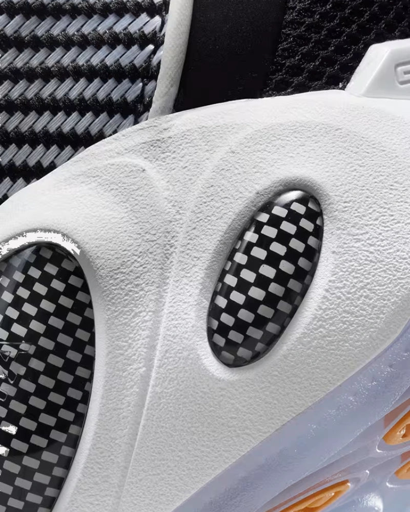 Estas sneakers destacan por su upper en malla negra con superposiciones tonales que aportan estructura y soporte, mientras que la parte inferior del upper introduce un patrón gráfico en blanco y negro que genera un llamativo efecto visual de líneas diagonales. El Swoosh blanco en miniatura se ubica sobre este fondo texturizado, complementando con precisión los detalles reflectantes que bordean la parte superior del diseño. En la mediasuela, los característicos orificios ovalados revelan detalles internos con el mismo patrón gráfico y se integran a una base blanca limpia con suela translúcida en azul hielo, que añade un toque moderno sin sacrificar tracción ni rendimiento.