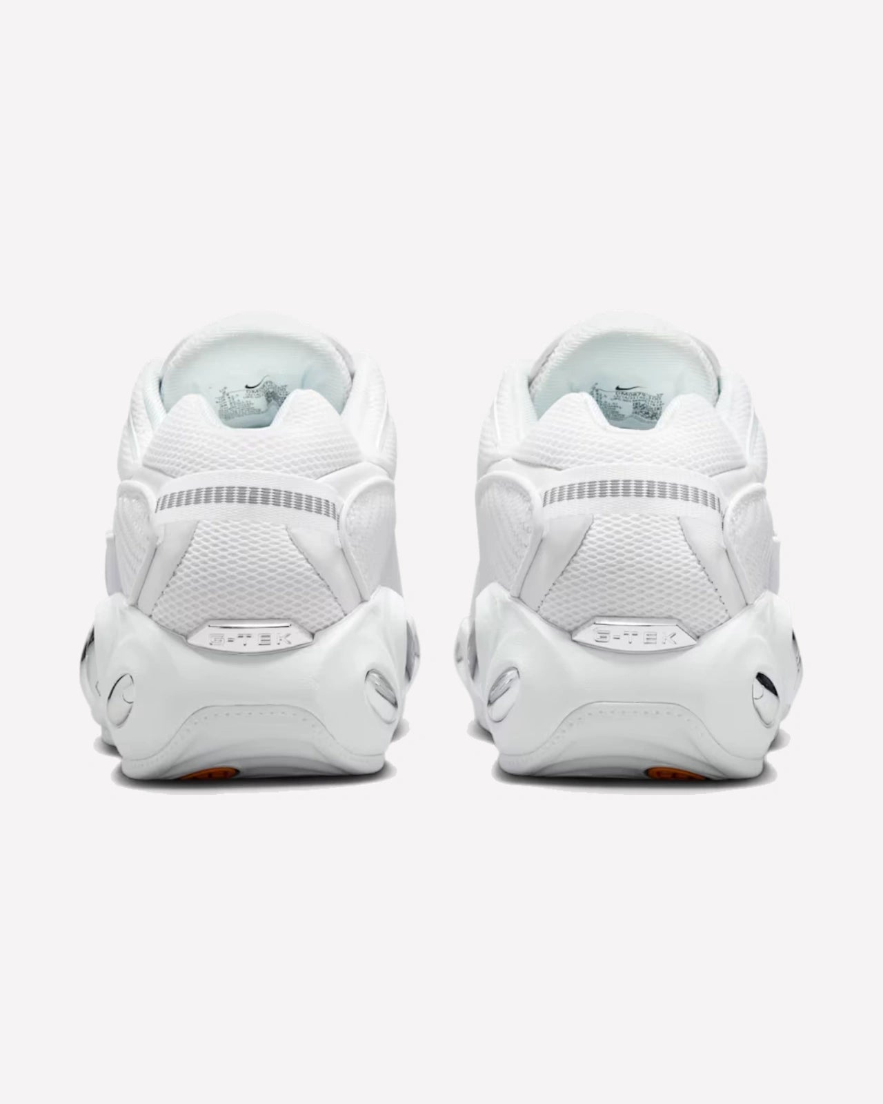 Fabricadas con una base de malla blanca de alto rendimiento, las NOCTA Glide presentan paneles sintéticos que refuerzan la durabilidad sin comprometer la ligereza. El color blanco domina toda la silueta, ofreciendo una estética limpia y versátil, mientras que los detalles cromados en las unidades de la mediasuela y en las aberturas laterales añaden un toque lujoso y moderno. El icónico Swoosh de Nike aparece en miniatura sobre el lateral, acompañado del logo “NOCTA” grabado sutilmente sobre los componentes metálicos, remarcando la exclusividad del diseño. La suela exterior, de goma translúcida con toques de color ámbar, completa el look con un acabado inesperado que añade tracción y contraste.