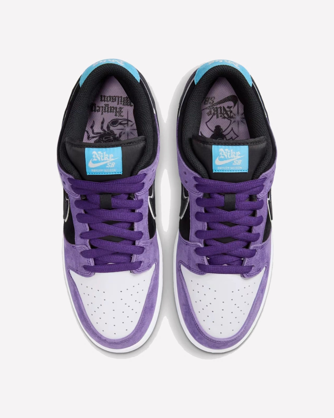 El diseño presenta una base de gamuza morada de textura suave y refinada, que se combina con paneles en negro profundo en los laterales, ofreciendo un contraste elegante y audaz. La puntera blanca perforada no solo mejora la transpirabilidad, sino que aporta equilibrio visual al conjunto. El Swoosh negro con borde gris añade un toque sofisticado y limpio. Detalles en azul celeste vibrante adornan el talón y la lengüeta, creando acentos llamativos que rompen la monocromía. Uno de los elementos más destacados es la suela translúcida en tono hielo, que revela un gráfico personalizado inspirado en los gustos y estilo de vida de Hayley, incluyendo un dibujo de un tigre y detalles de estrellas que refuerzan la exclusividad del diseño.