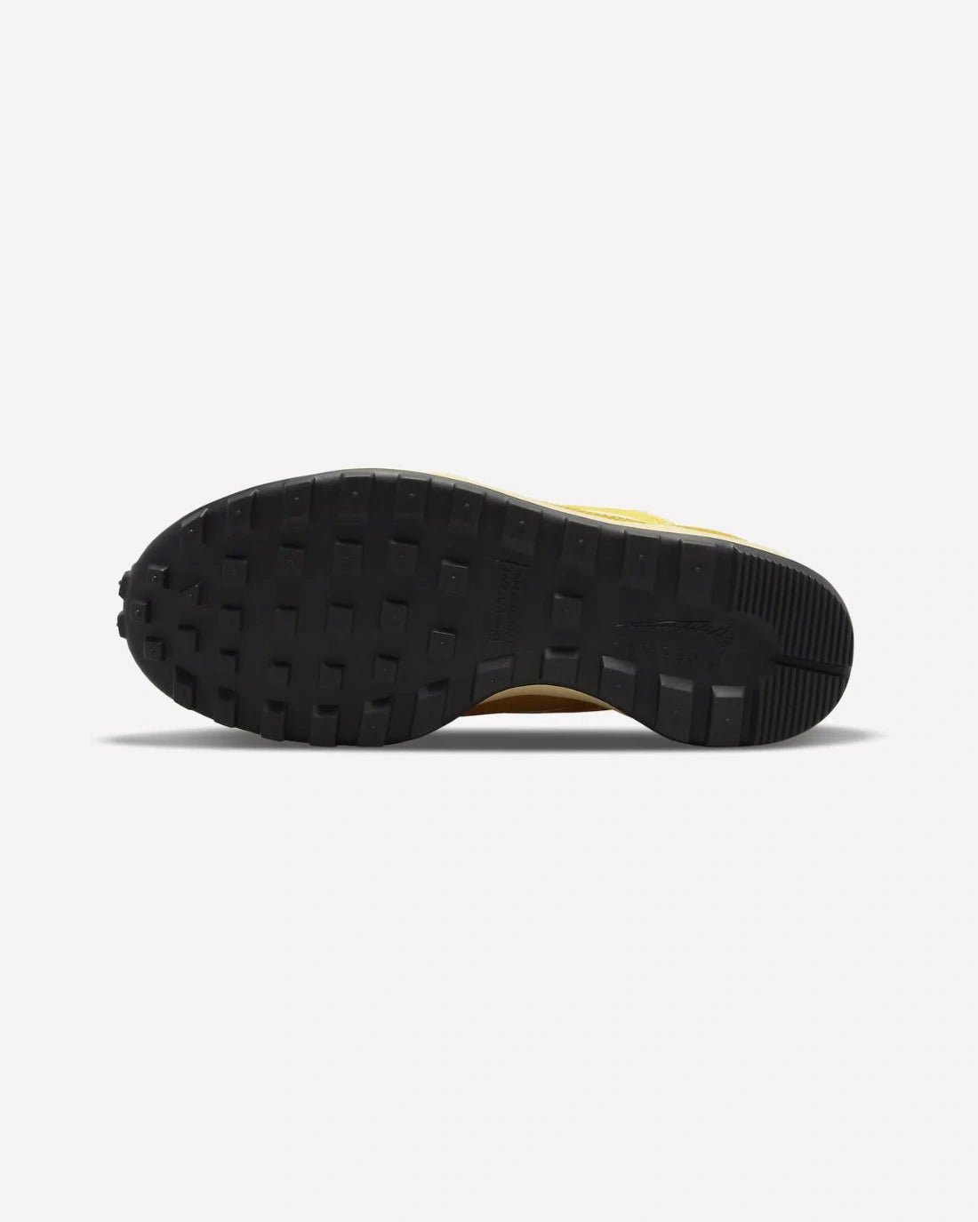 El upper está compuesto por una mezcla de malla y suede, con un color amarillo cálido que destaca, mientras que el Swoosh blanco en los laterales crea un contraste atractivo. Los detalles en naranja brillante y los pequeños toques de rojo en las lengüetas, junto con los tiradores visibles en el talón, aportan un toque moderno y distintivo. El diseño de la suela de goma negra y el patrón de tracción optimizado no solo ofrecen durabilidad y comodidad, sino que también añaden un estilo industrial que es característico del trabajo de Tom Sachs.